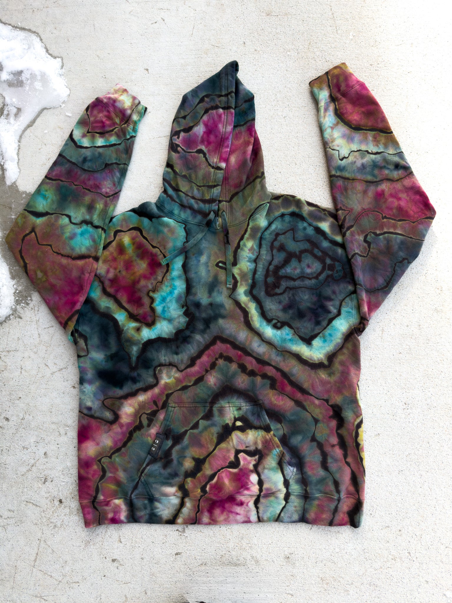 One-of-one reverse ice-dyed hoodie. Hand-dyed under the shadow of Mt. Crested Butte and finished with a hand-stitched CB/CO kangaroo pocket patch and a Ride Me Dyes interior patch label.