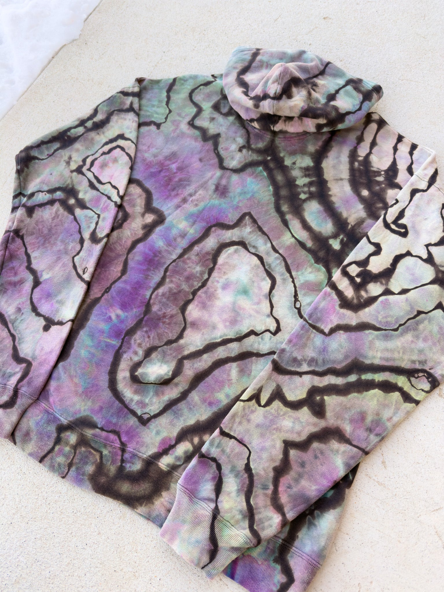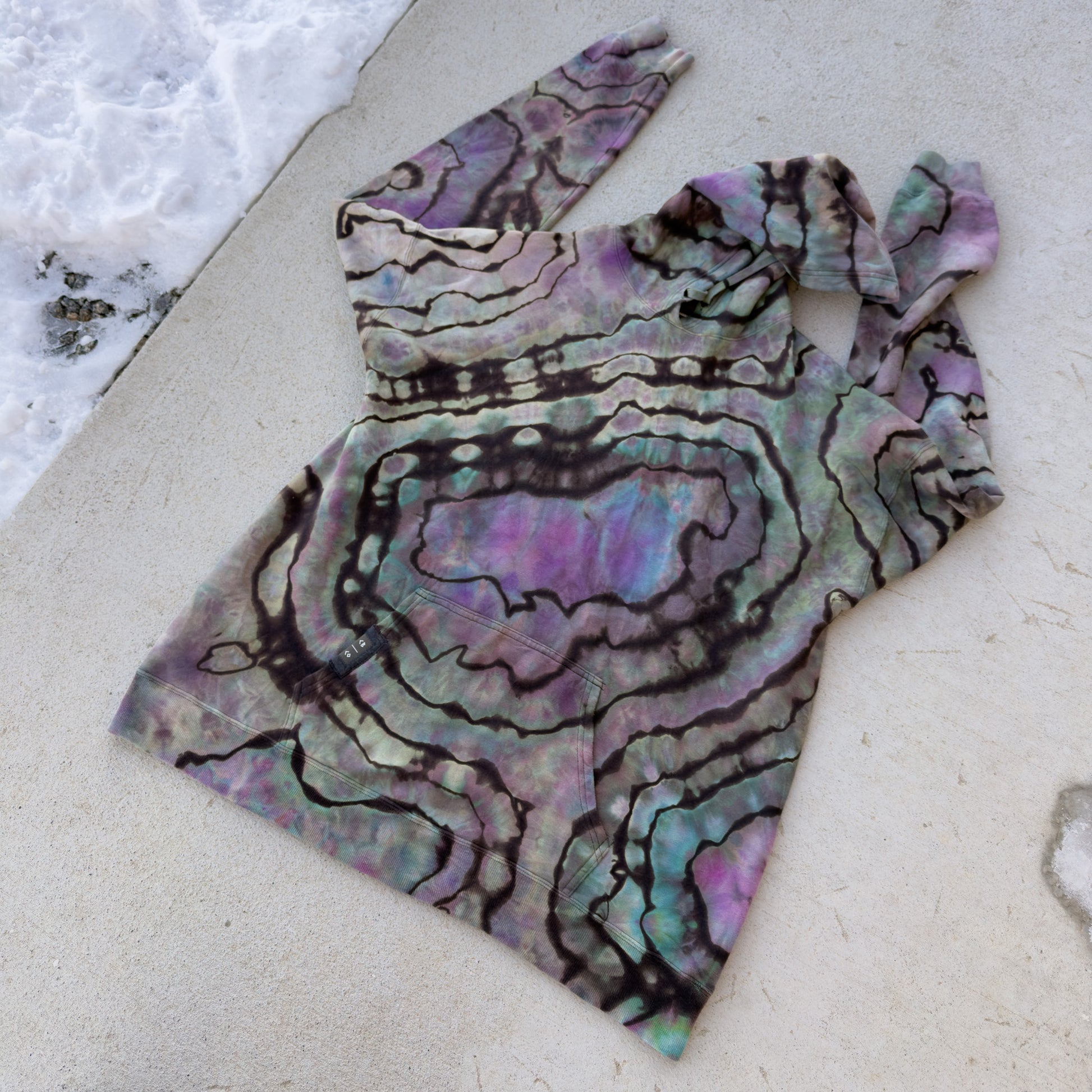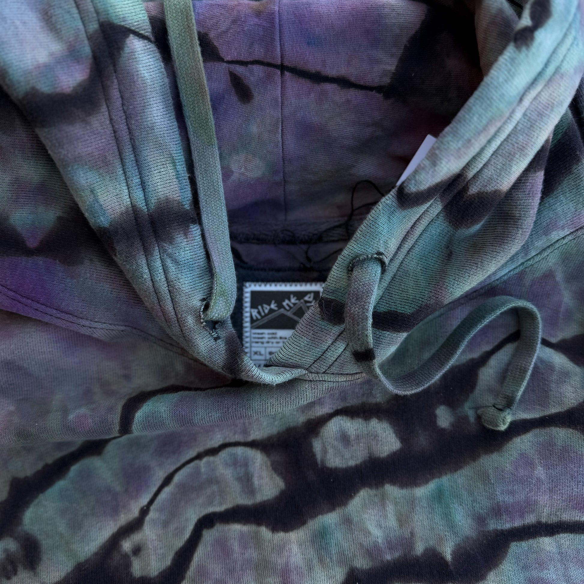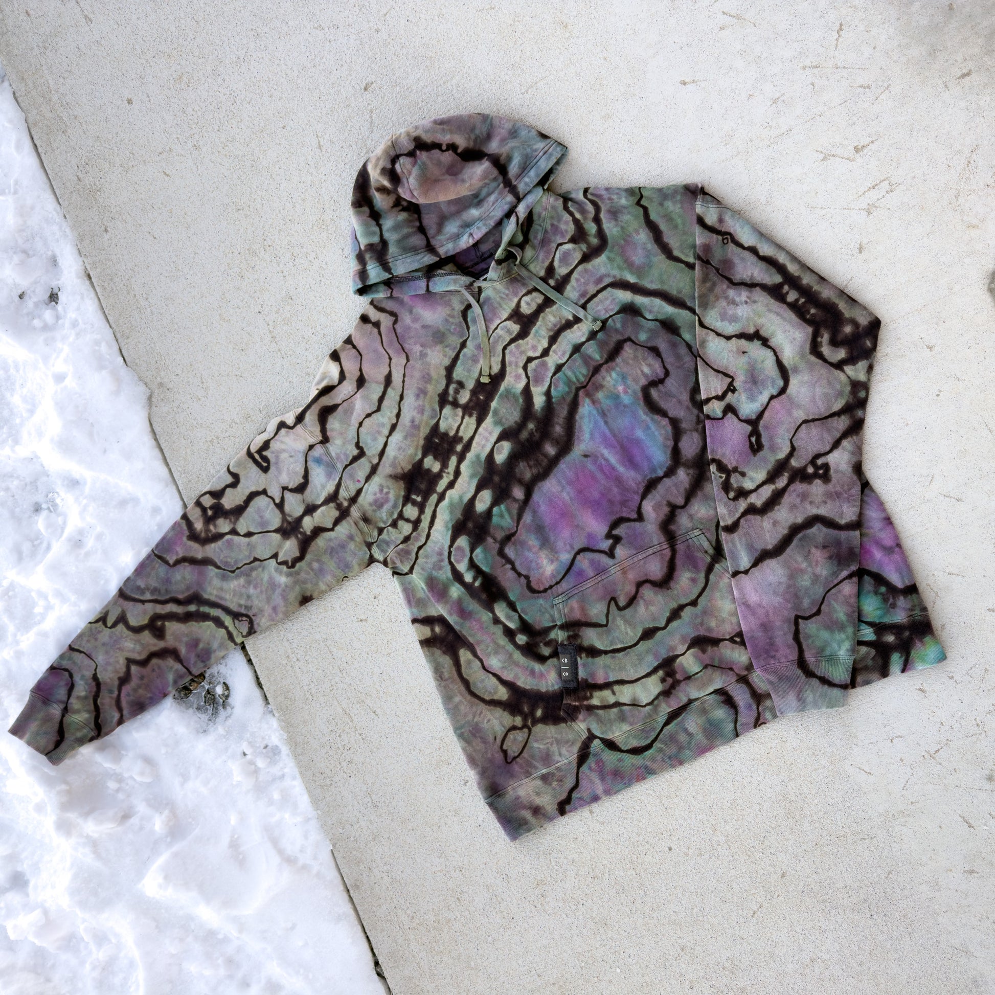 One-of-one reverse ice-dyed hoodie. Hand-dyed under the shadow of Mt. Crested Butte and finished with a hand-stitched CB/CO kangaroo pocket patch and a Ride Me Dyes interior patch label.